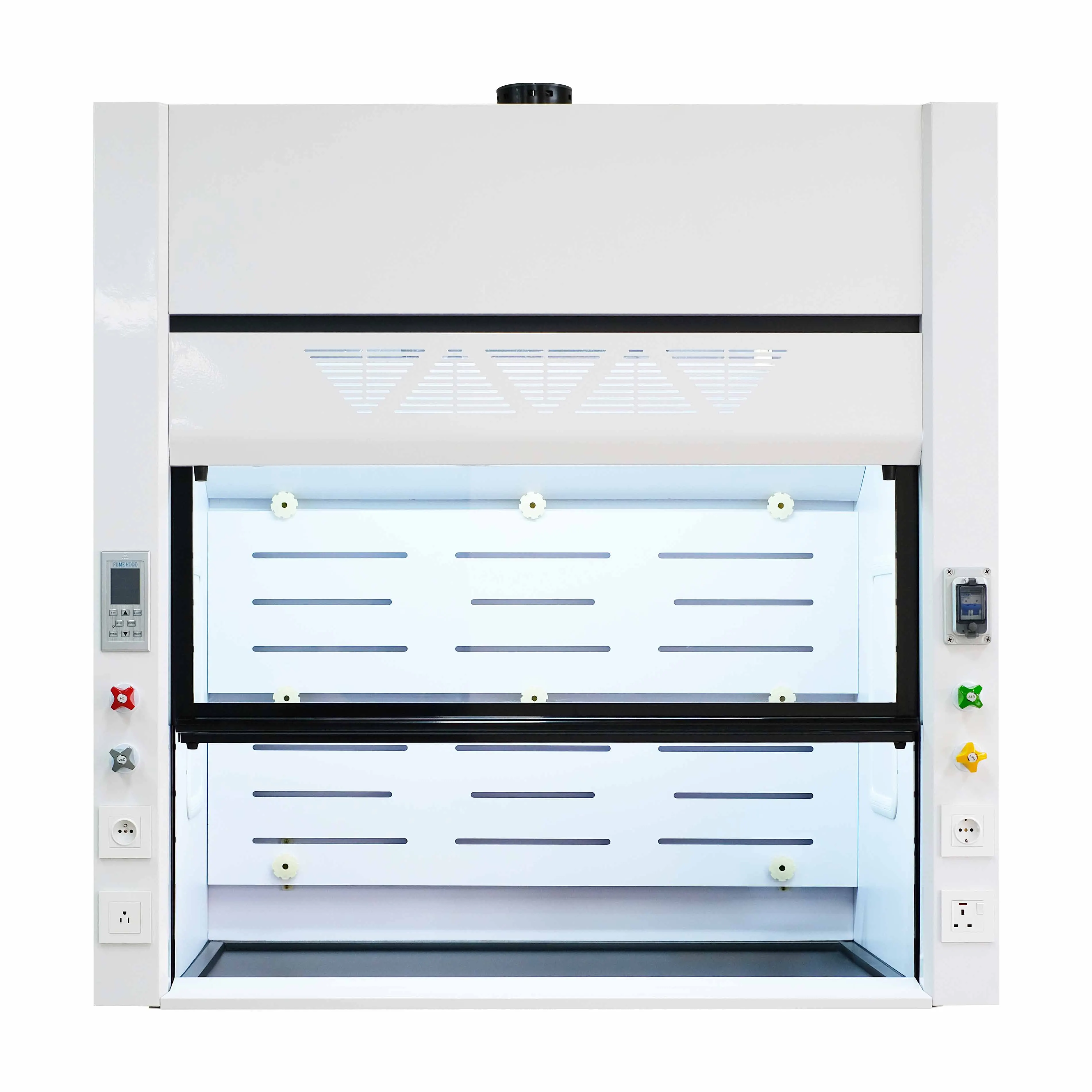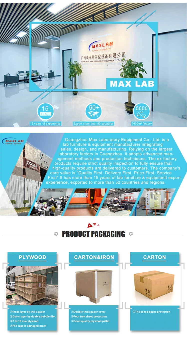 2.Controller: Intelligent switch with digital display, multiple controls such as power on, fan, lighting, socket, sterilization, damper, etc..3.Glass sash: Use explosion-proof 5mm tempered glass, aluminum alloy sash handle. It is designed by the weight balance method in the mechanical principle, and the left and right are connected by synchronous wheels.4.Lighting: Equipped with LED 30W purification lamp, the luminosity is greater than 300LUX.5. Fume hood liner liner and Baffle: Use 5mm Compact grade laminate, baffle fixed with PP material6. Junction box: The junction box with circuit board and AC contactor makes wiring more convenient. Suitable for 110V-230V voltage.7. Standard accessories: 4x Electrical Outlets1x 250 or 315mmφ PP hood8.Optional accessories: PP oval cupsinkRemote Controlled Fixture gas&water faucetExplosion-proof lightDistillation Grid KitDuctworkExhaust blower